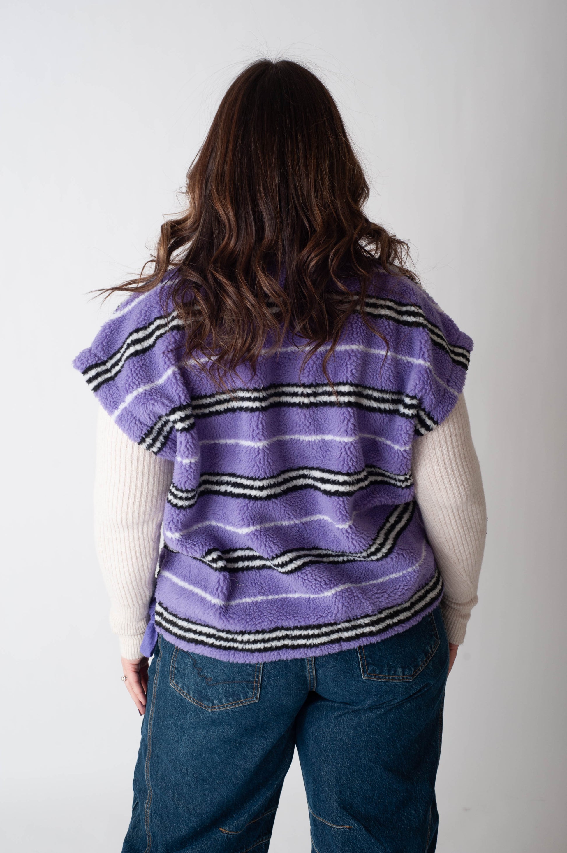 The Andrew Sherpa Vest is a sleeveless high neck sherpa vest with snap closures, two side pockets and ribbon bow drawstrings at the side.