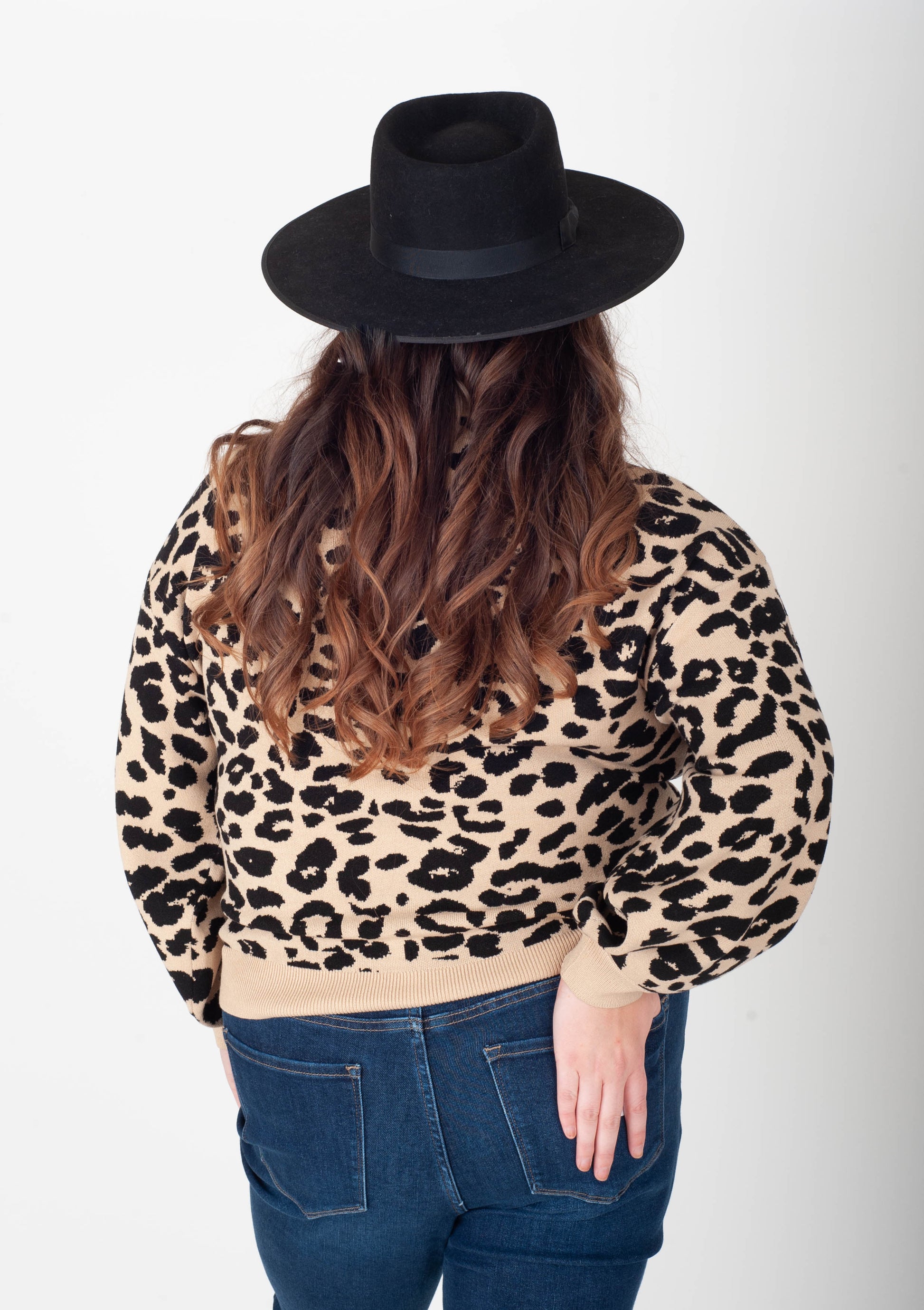 Upgrade your wardrobe with warm and trendy styles for the new season. The Charlotte Sweater is a round neck leopard print sweater with contrasting ribbed cuffs.