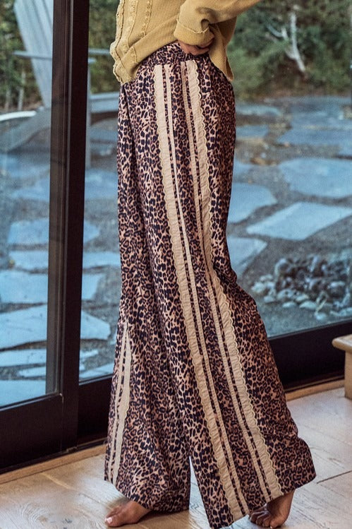 The Ethan Leopard Pants are an elastic waist drawstring pant with an all over leopard print and two athletic lace strips down the side.
