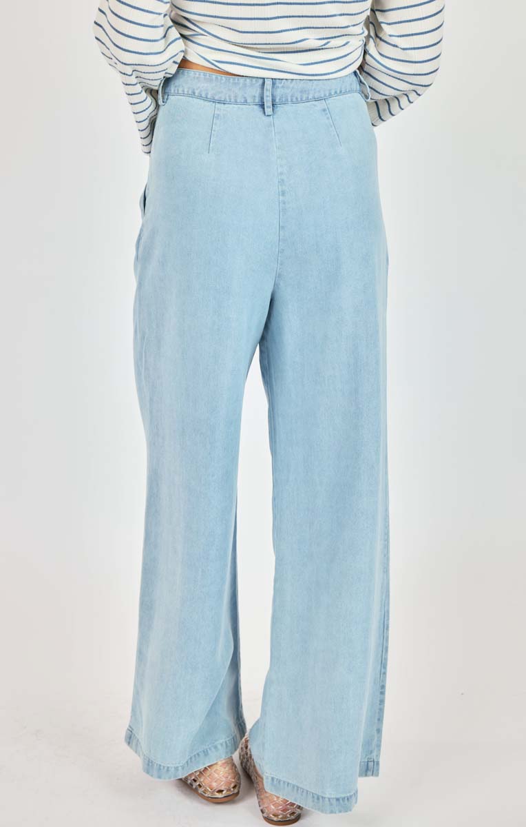 The It's Pouring Pants are a high waisted wide leg jean with pleats through the front. It features a traditional button fly closure and two side pockets.