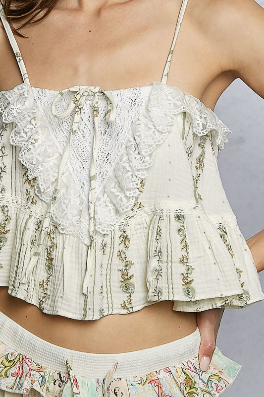 A cropped floral-print sleeveless top with spaghetti straps and a ruffled hem, featuring a central ribbon tie, lace ruffles along the upper bust, and a triangular centerpiece decorated with lace trim.