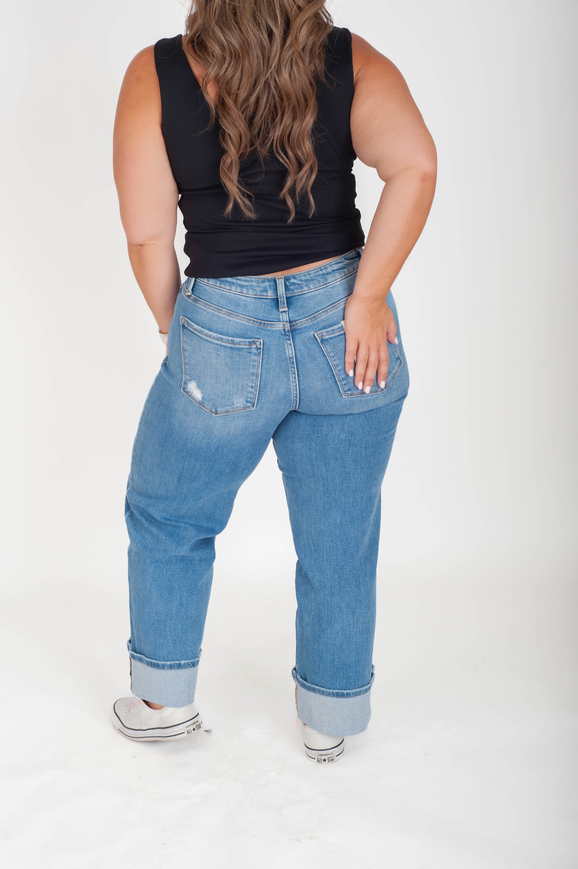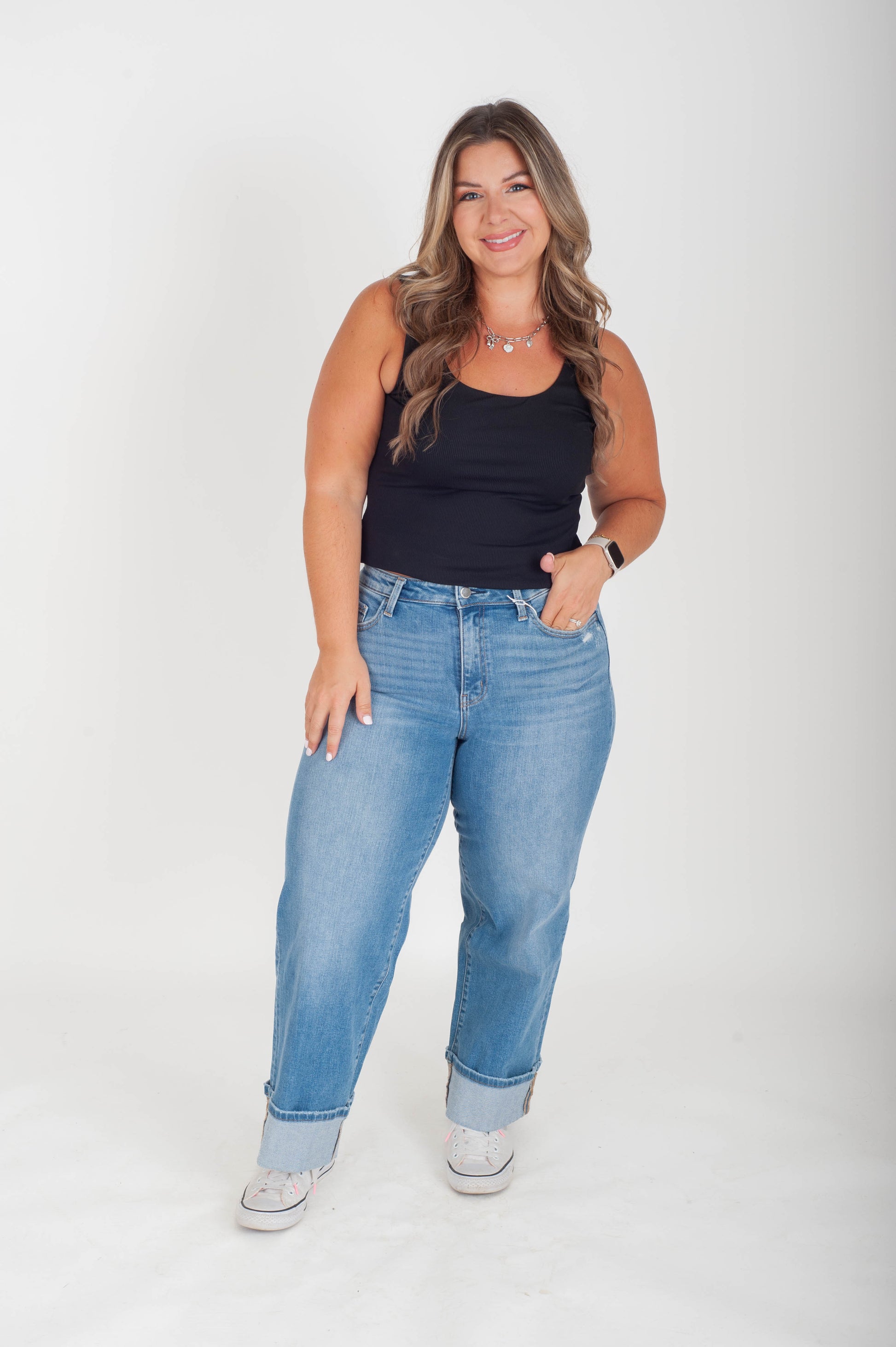 Le jean large Moorland est un Jean large court à taille haute et ourlet simple à revers dans le denim extensible confortable signature.