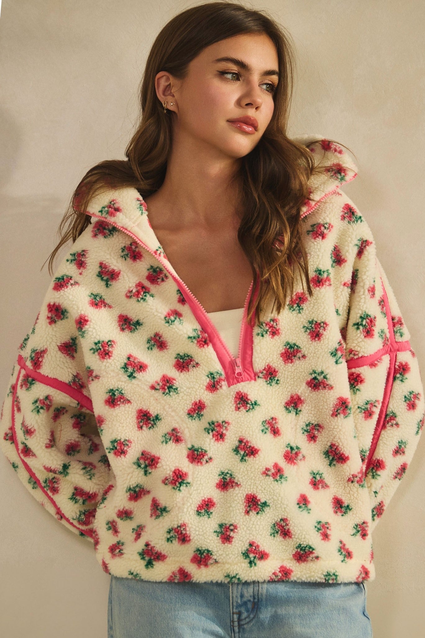 The Rose Sherpa is a long sleeve quarter zip sherpa with an all over pick rose pattern. It features bright pin contrasting seams and wrist cuffs.