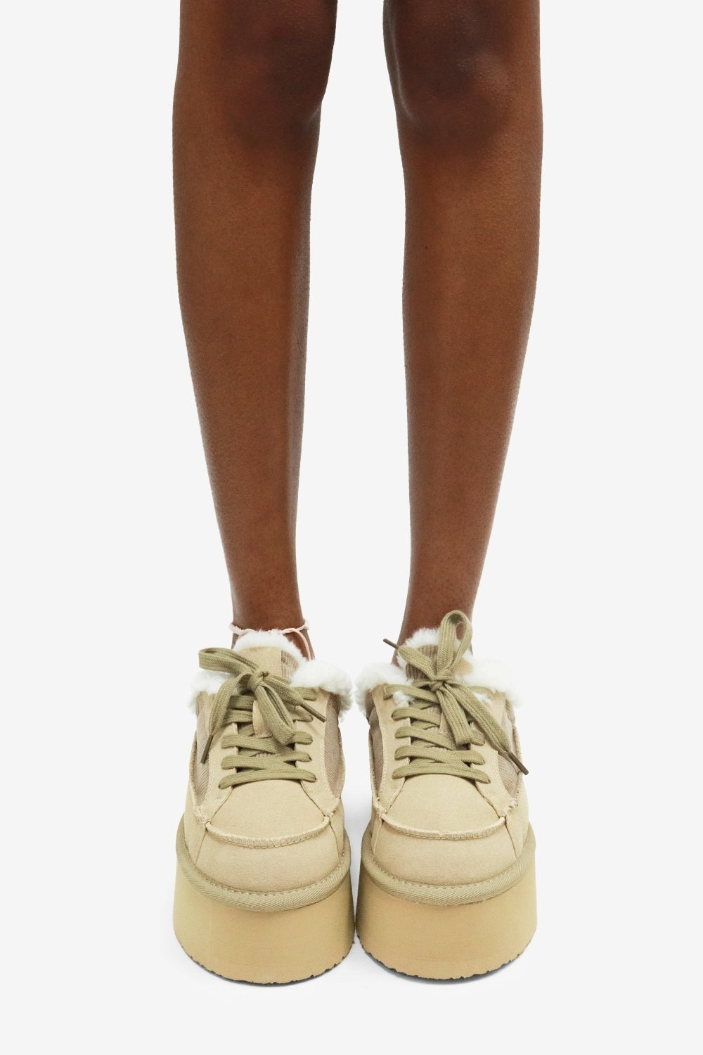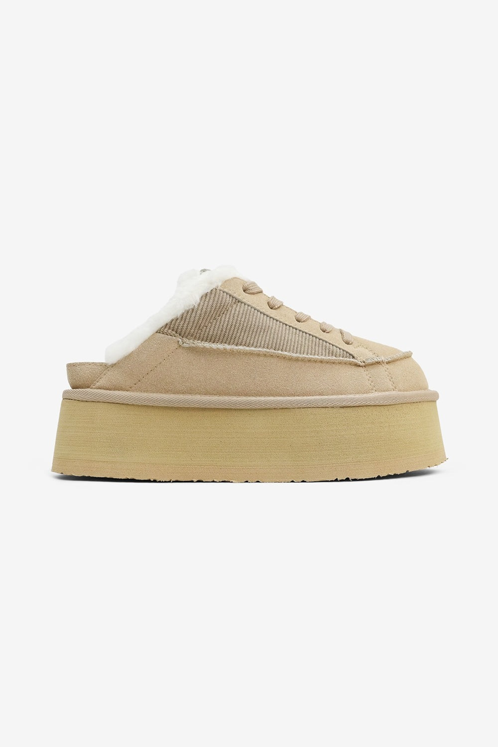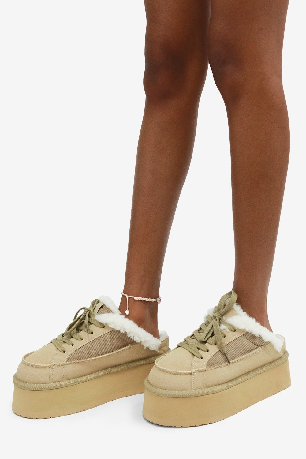 The Tareeze sneaker-slides feature a tan suede upper with a soft, warm lining, ensuring your feet are snug and stylish. The standout design includes a lace-up front for a sneaker-inspired look, combined with a platform sole that adds height and a modern twist. The Tareeze is perfect for those chilly mornings or casual outings, providing warmth without sacrificing fashion.