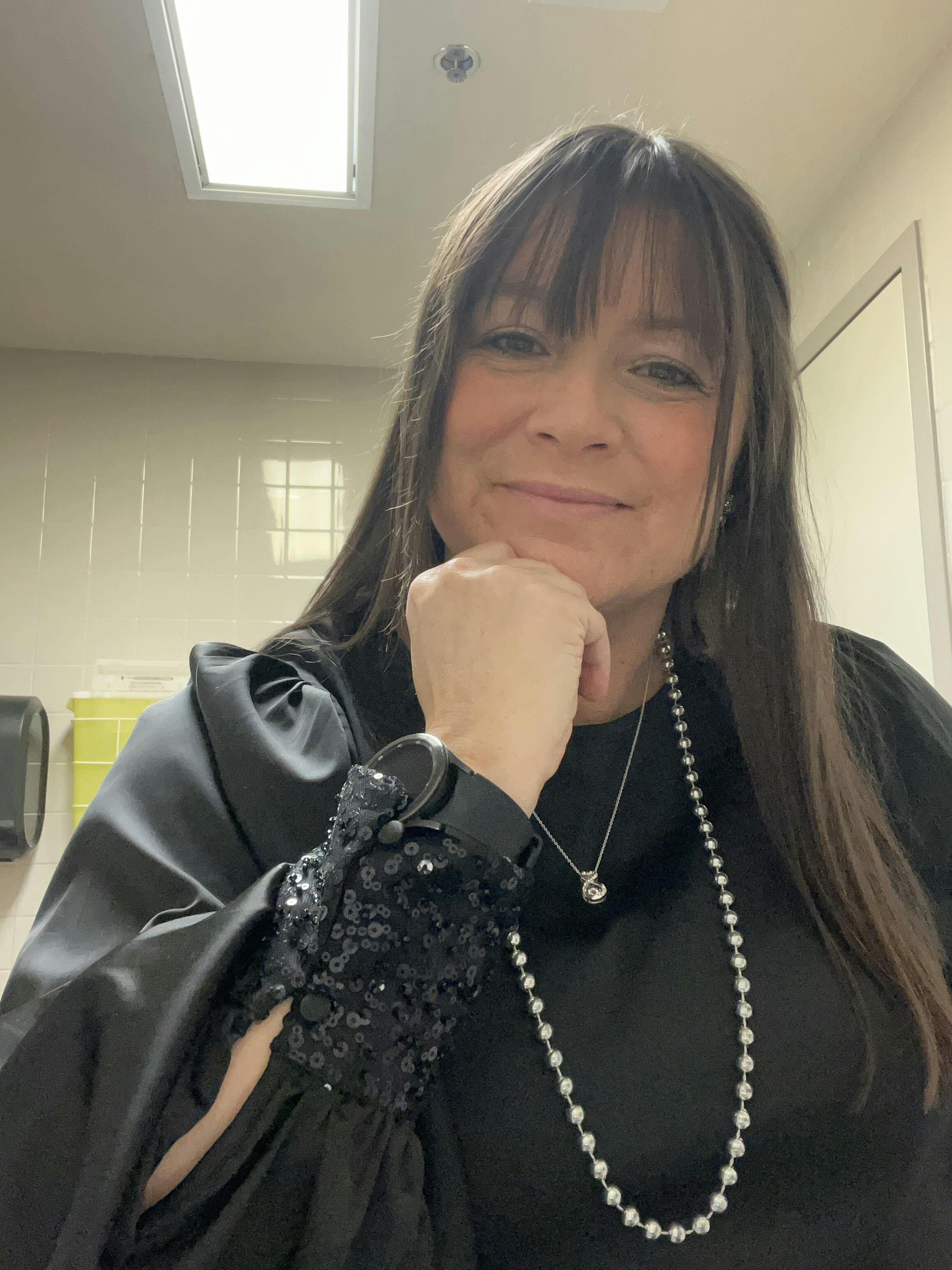 The Yolanda Blouse is a round neck long sleeve blouse with sequin cuff details at the wrist. It features a key hole and button back and a flowy balloon sleeve.