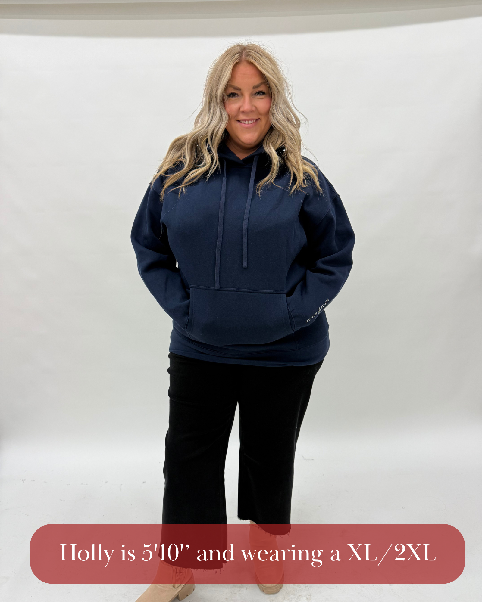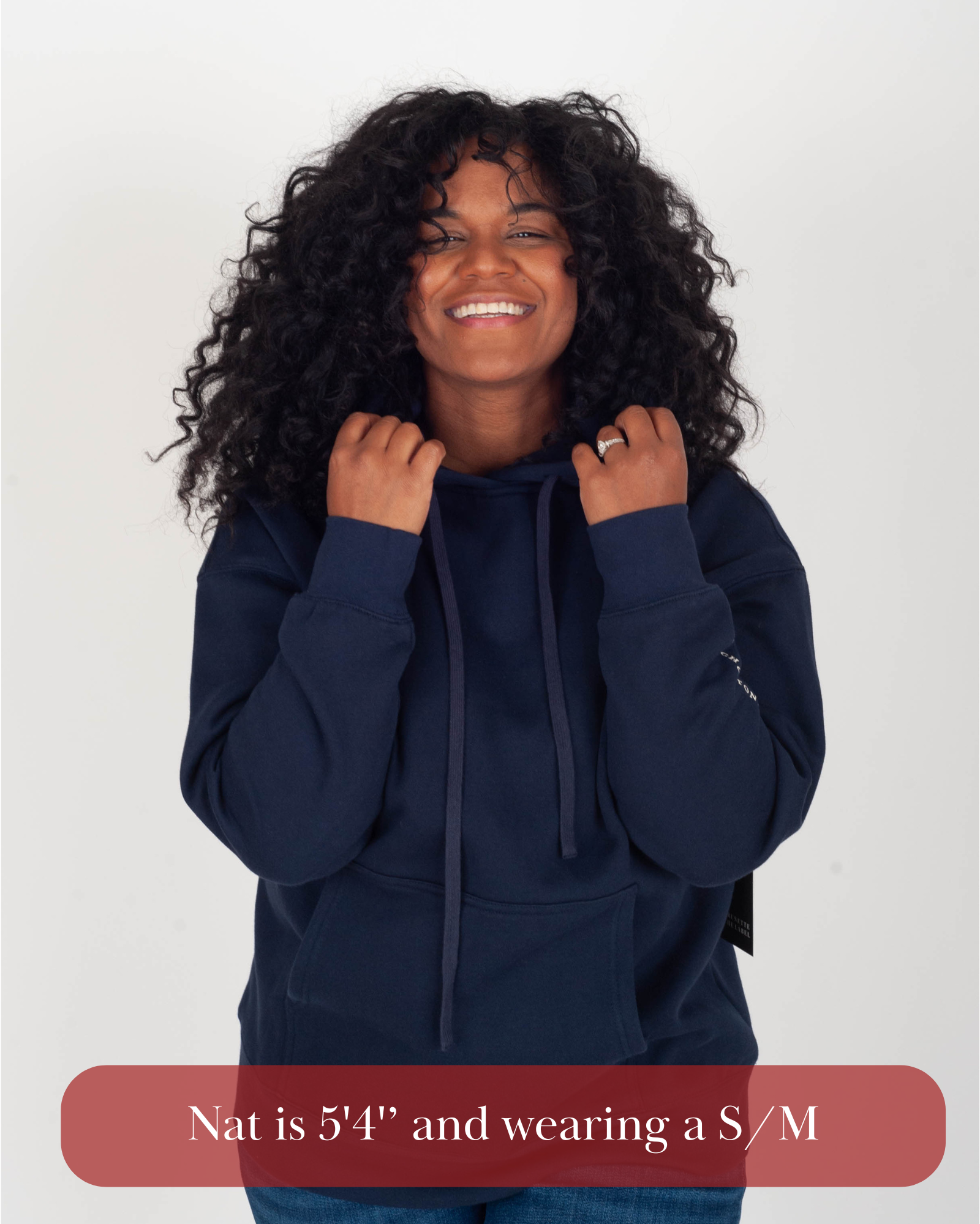 Erin is wearing an XS/S. Nat is wearing the hoodie in a S/M. Brie wears a M/L. Holly is wearing the Hoodie in a XL/2XL. Bryanna is wearing the hoodie in a 2XL/3XL.
