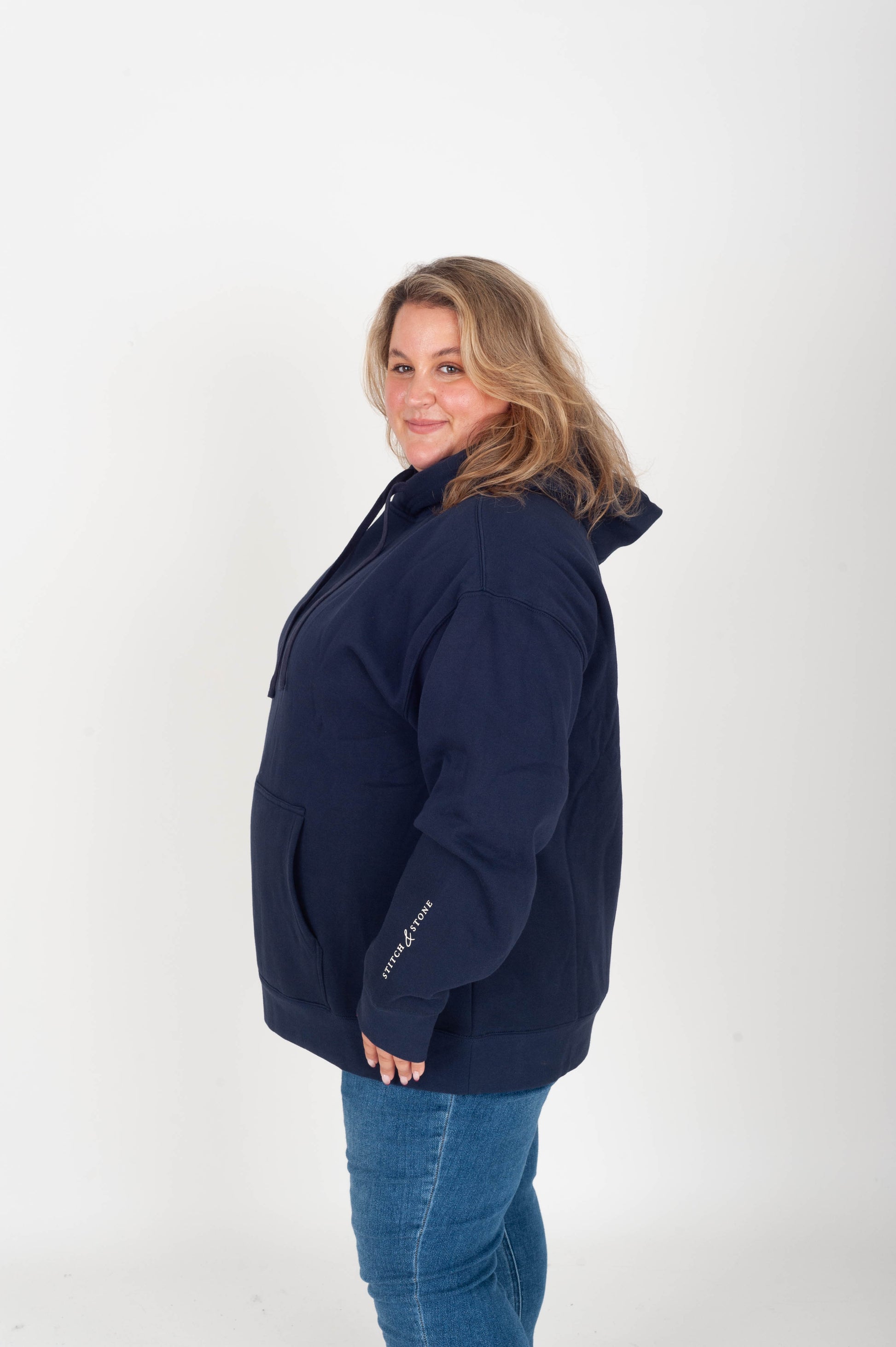 We have custom designed a big sister hoodie in a gorgeous navy with their iconic phrase "Babes Supporting Babes" printed on the back. The "supporting" is contrasting the silk screen print and is embroidered in a gorgeous red thread. Below the phrase you will see an "EST 2015" to remember our special 10 year anniversary. On the left sleeve, you see our Stitch & Stone logo printed.