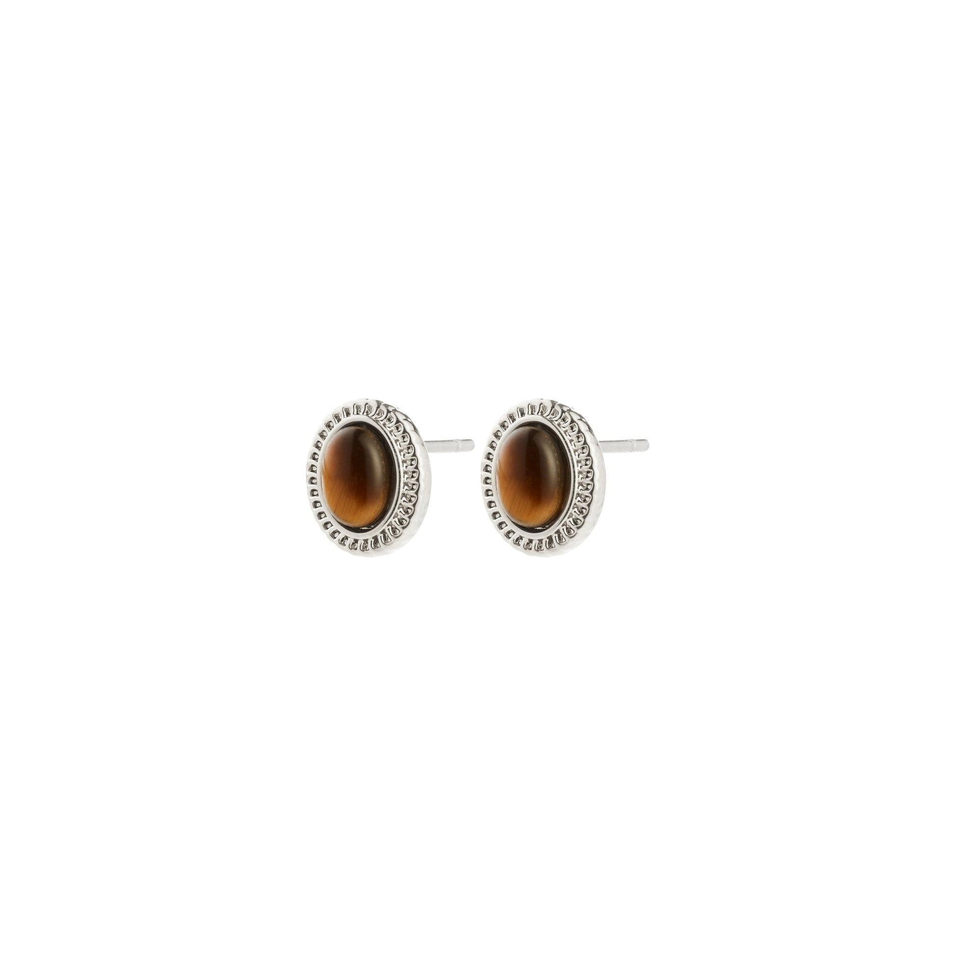 Between moments, new paths unfold! Embrace autumn with the silver-plated BETWEEN stud earrings from Pilgrim. The small cabochon-cut Tiger Eye stones capture the earthy essence of autumn, while the antique-inspired gold settings lend a touch of classic vintage charm to your look. Perfect for those who cherish boho chic with a hint of classical elegance. Pair them with a cosy knit and vintage-inspired jeans for a relaxed autumn style. The earrings are crafted from 75% recycled materials—style with a purpose!