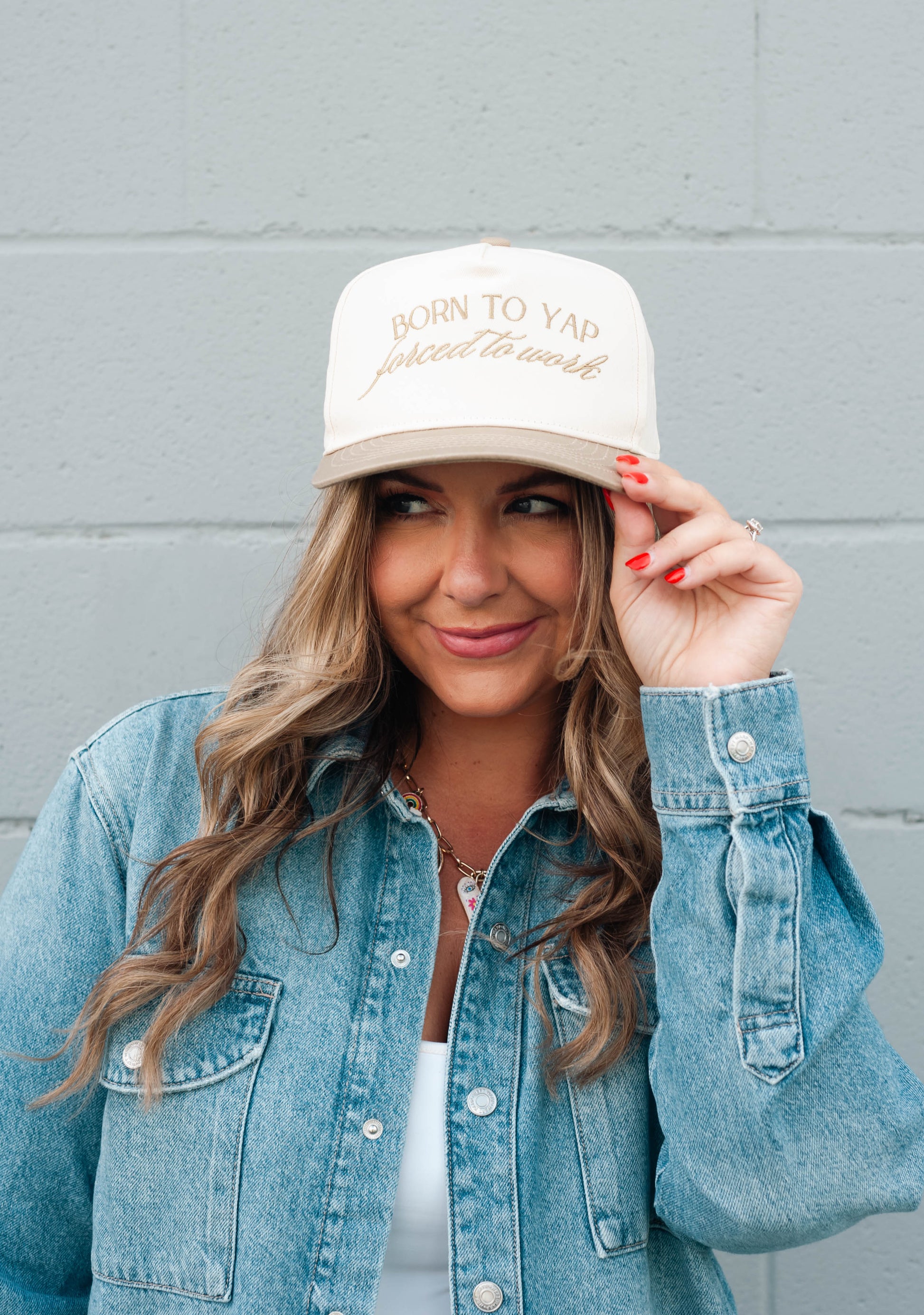 Trucker hat with "Born To Yap, Forced To Work" embroidered on the cap. Tan letters & Tan Cap.