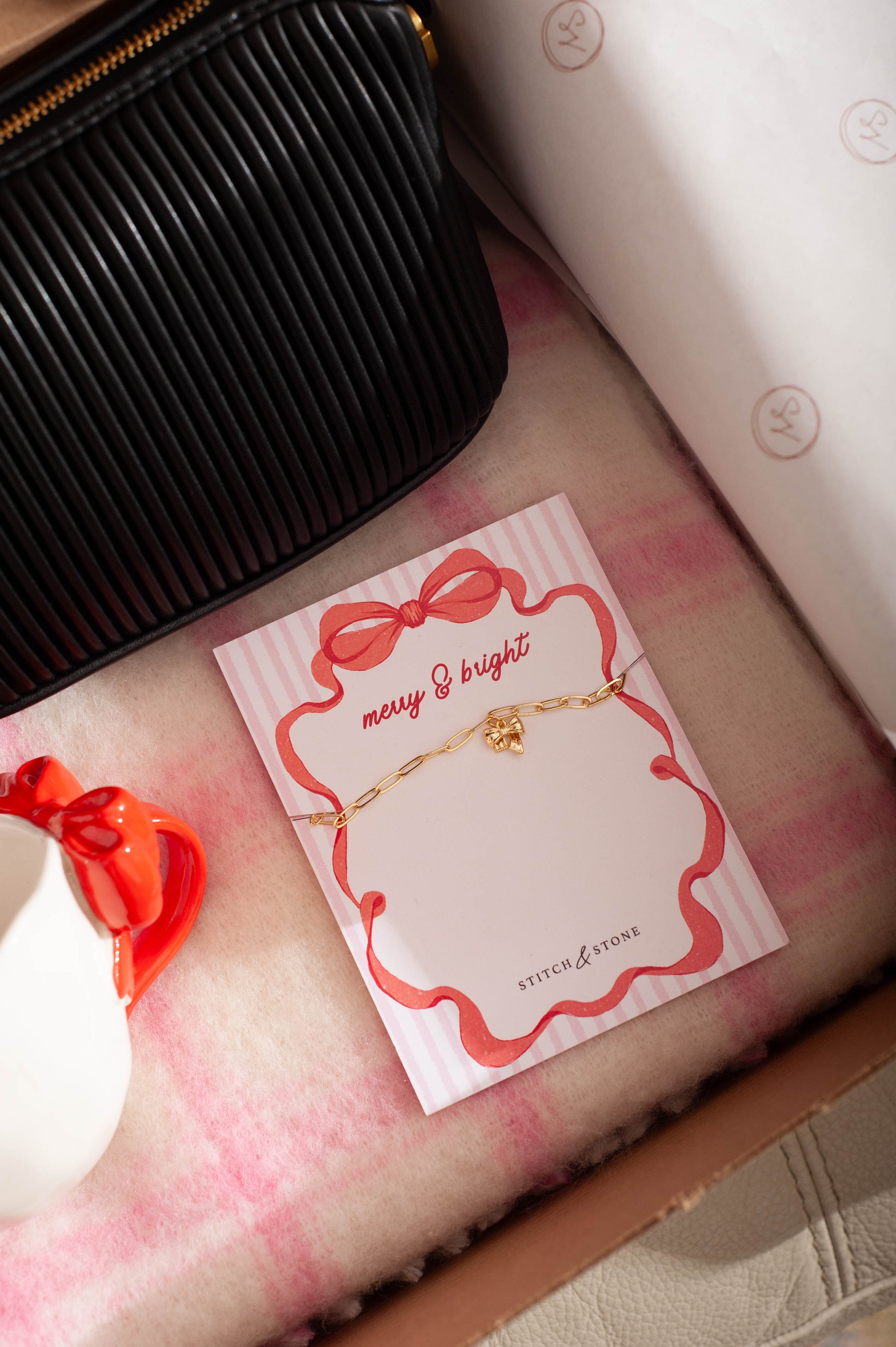 The Bow Charm Bracelet is a chain link lobster clap bracelet with a small bow charm on it.