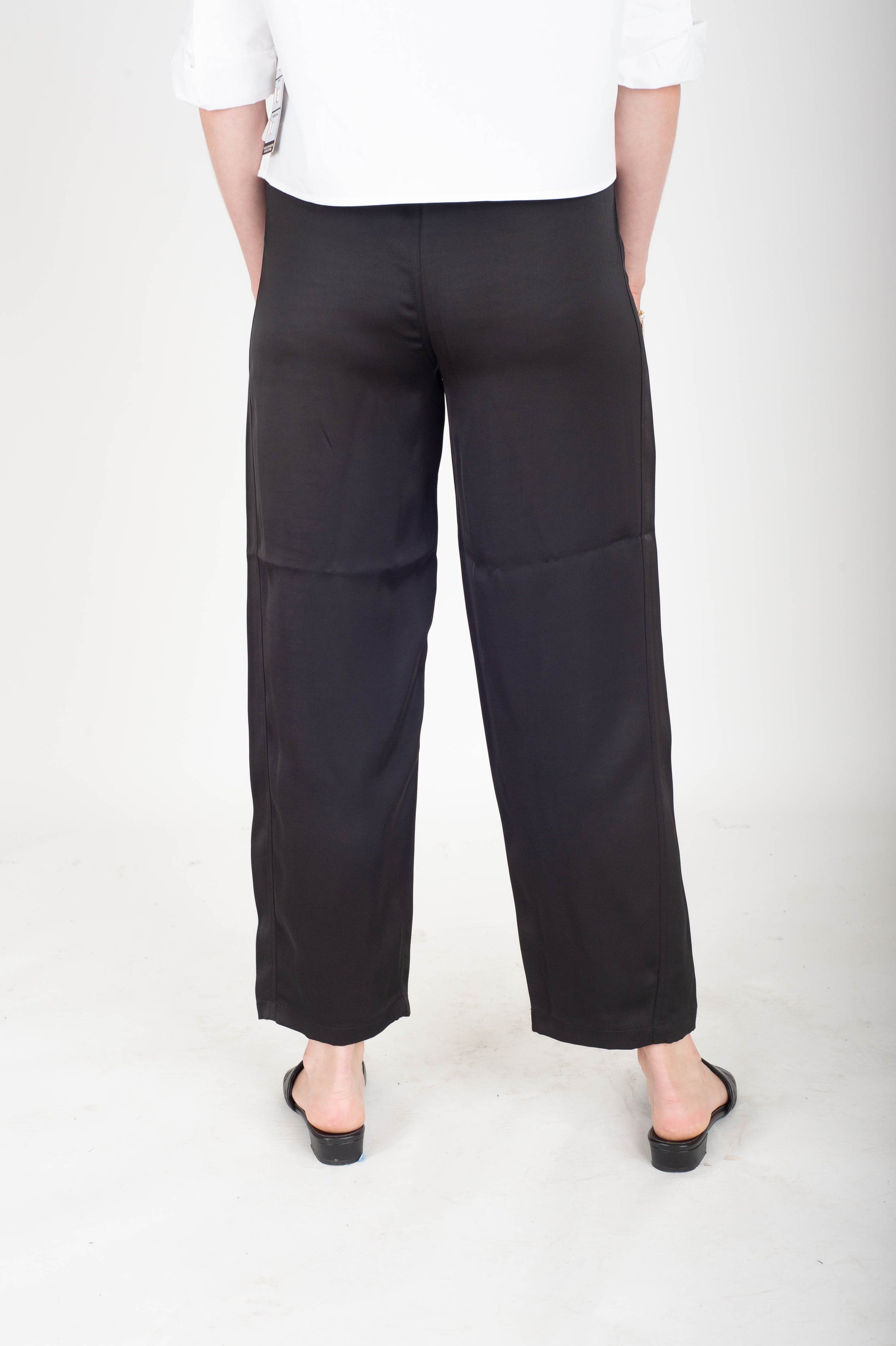 The Brenda Barrel Pants are a satin elastic waist pant with seam details down the front.