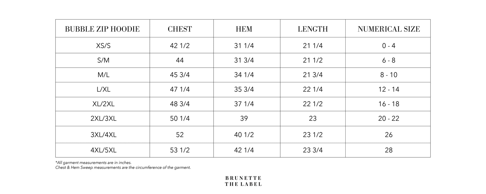 This hoodie is an oversized fit with an exaggerated bubble-like sleeve. It has a double-lined hood, full zipper, and front pockets. It sits perfectly at your natural waist, making it the most flattering length. It’s a staple you’ll reach for again and again!