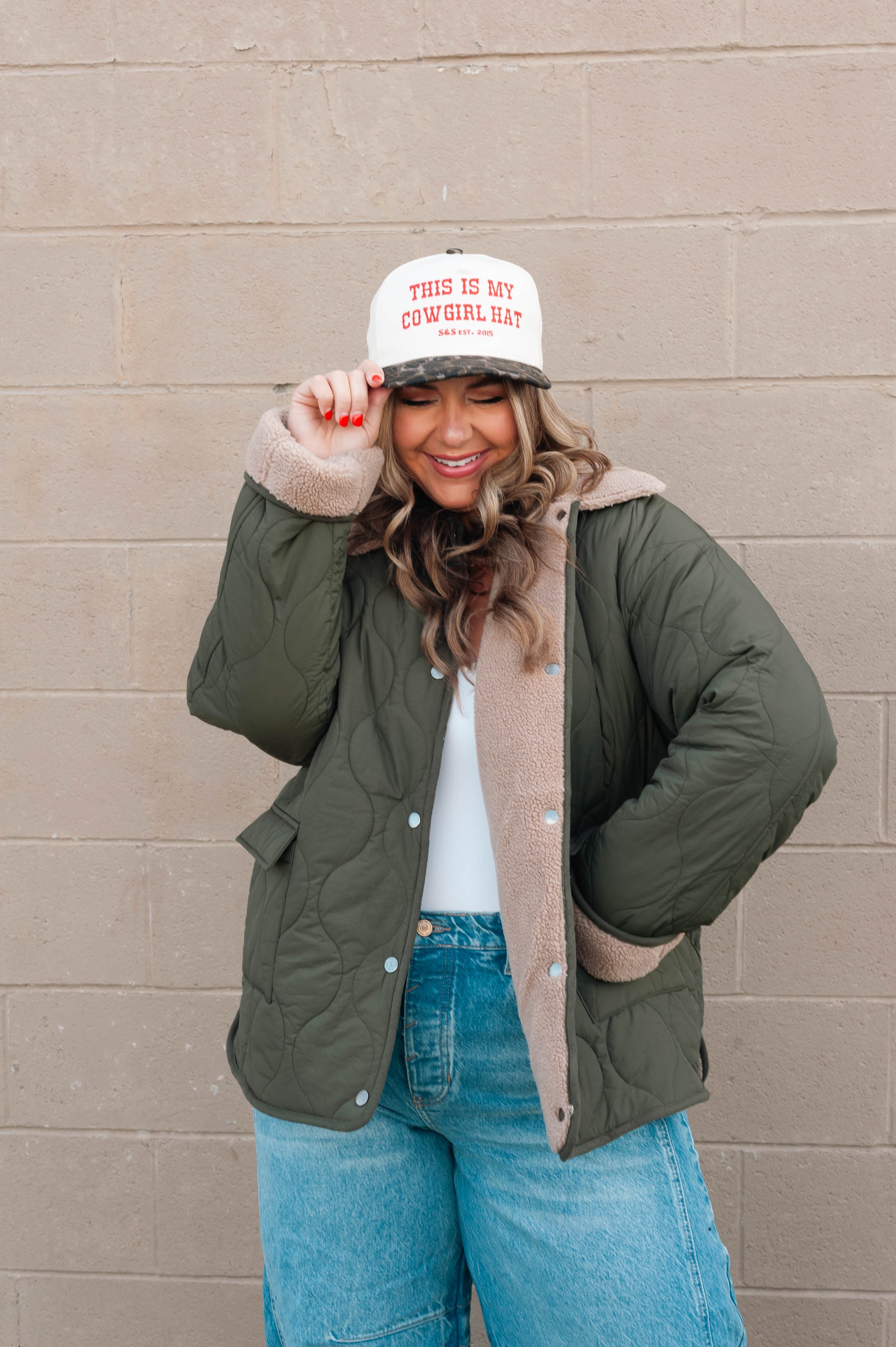 Trucker hat with "This is my cowgirl hat S&S est. 2015" embroidered on the cap. Red letters & leopard brim.