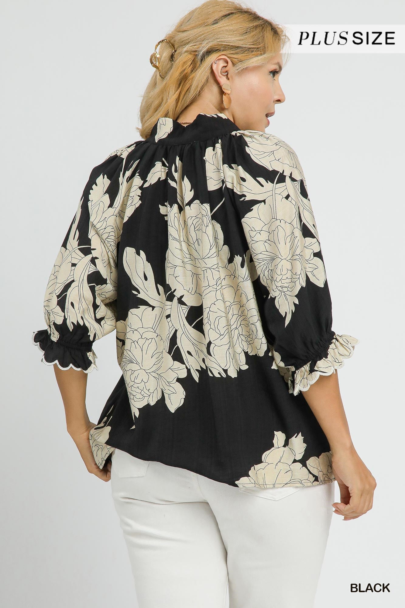 The Curvy Emma Blouse is a floral scallop trim blouse.