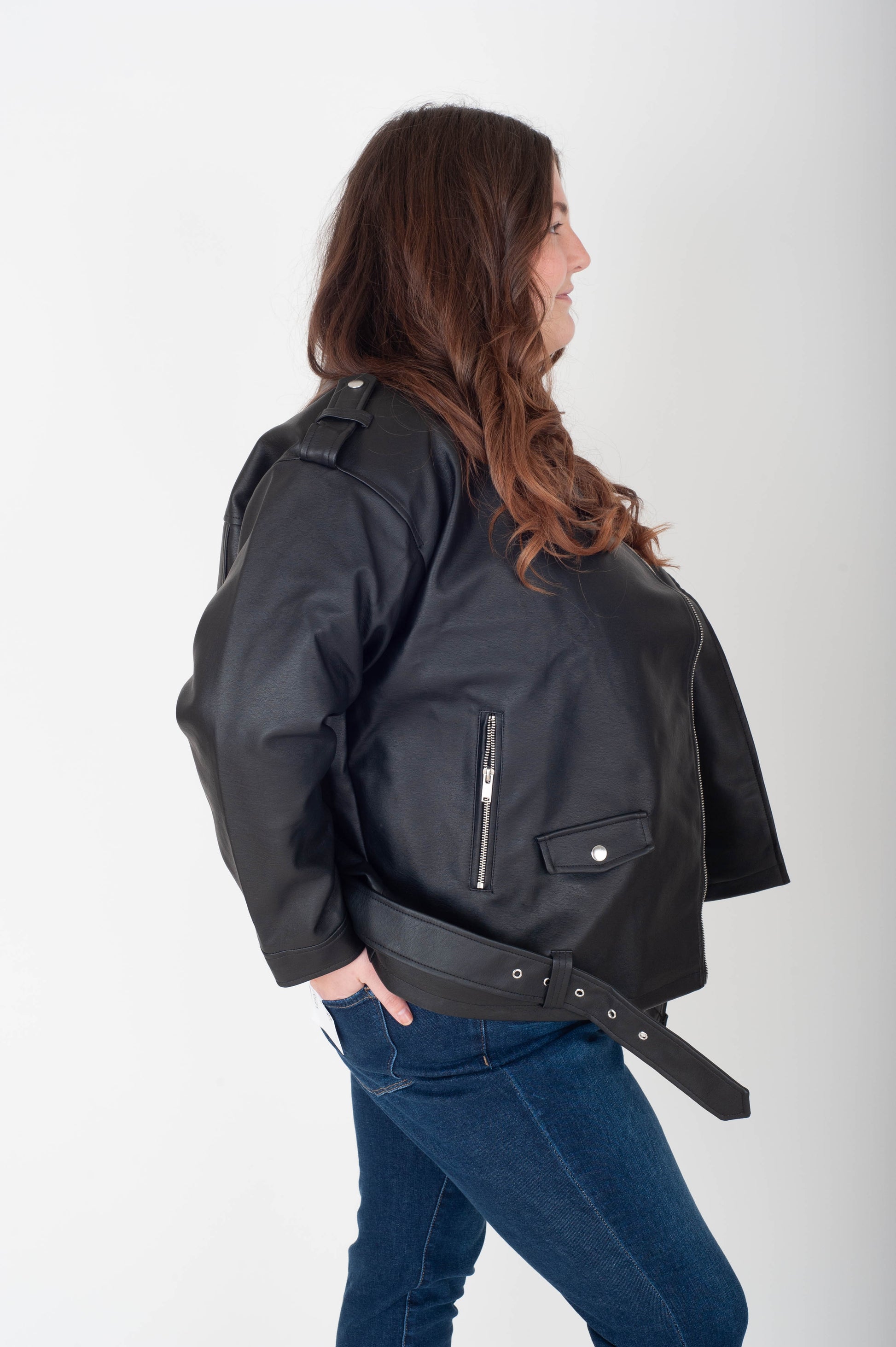 The Curvy Paulina Biker Jacket is a long sleeve zip up biker jacket with silver hardware. It features a belt at the cuff and two side pockets.