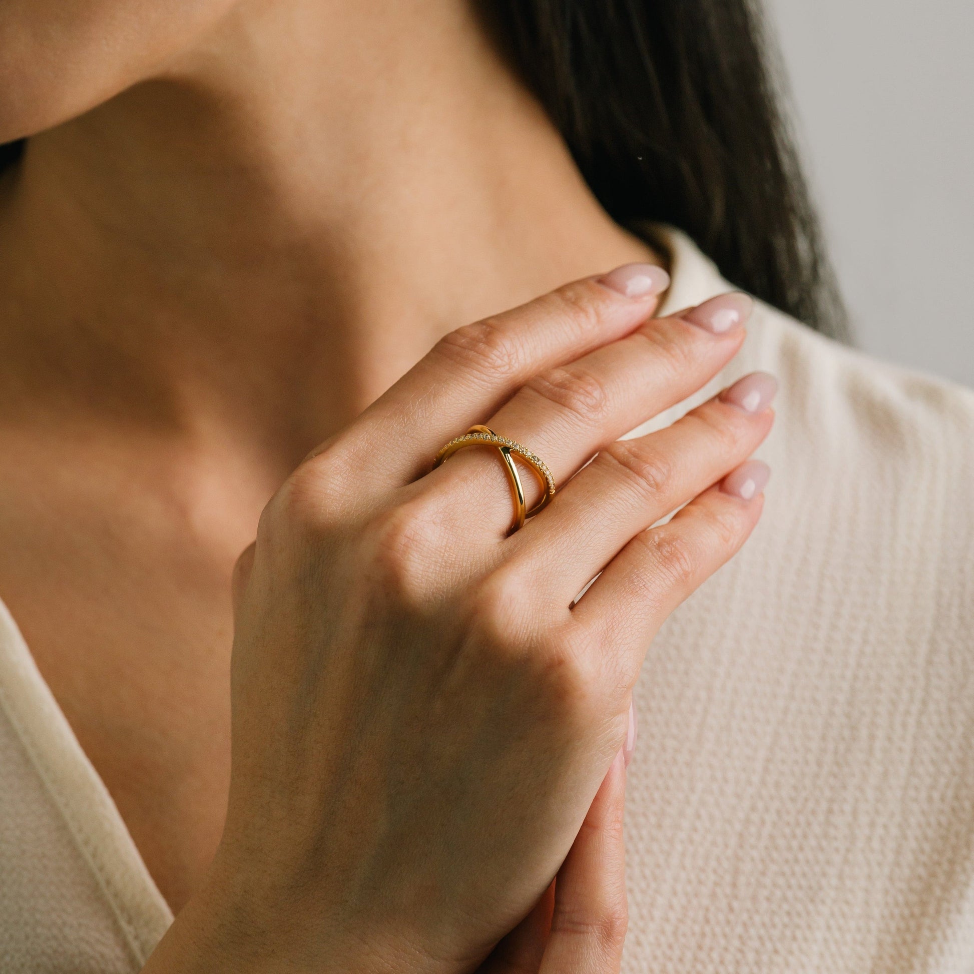 Size 7 Open Ring with cubic zirconia crystals and a 14K Gold-Plated Brass.