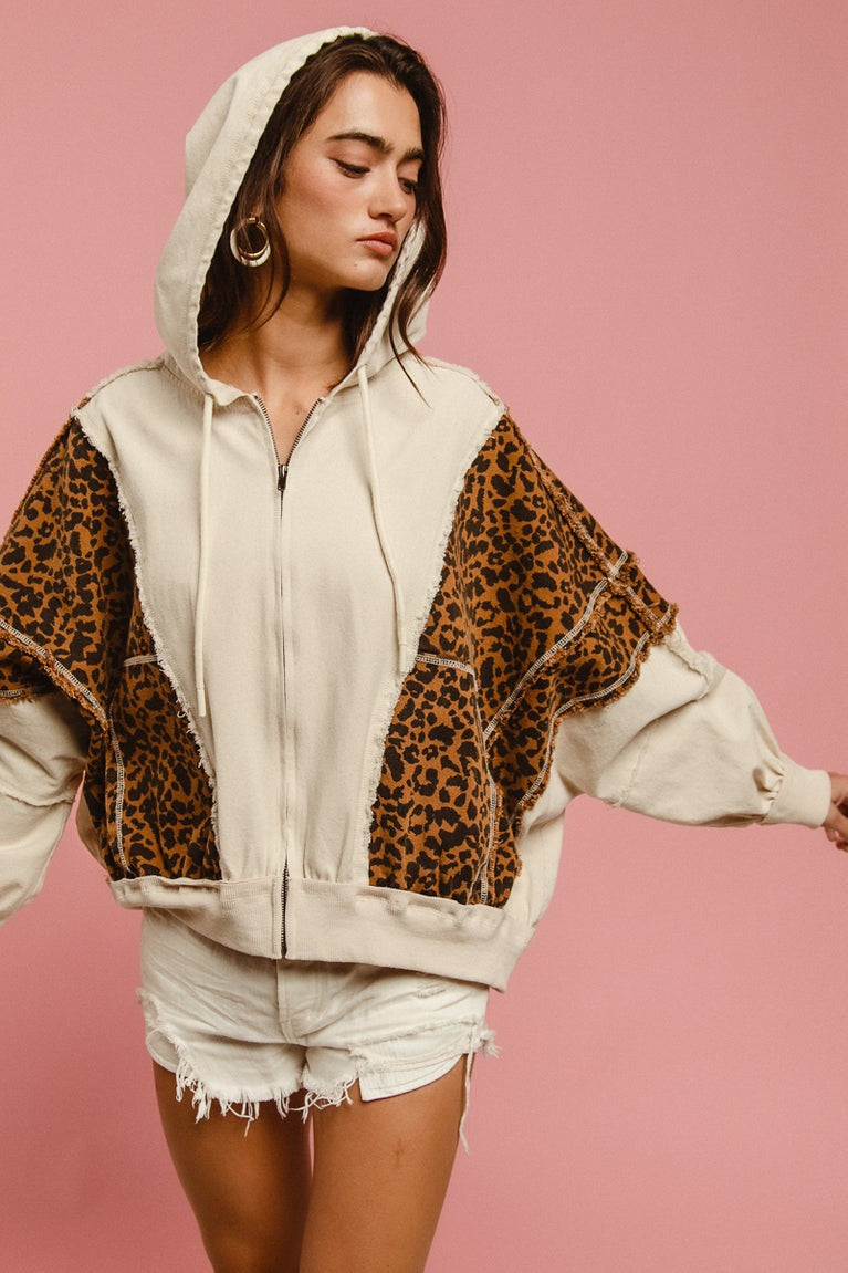 The Elias Hoodie is a long sleeve zip up hoodie with a block leopard print across the chest. It features a drop shoulder, two side pockets and a relaxed boxy fit.