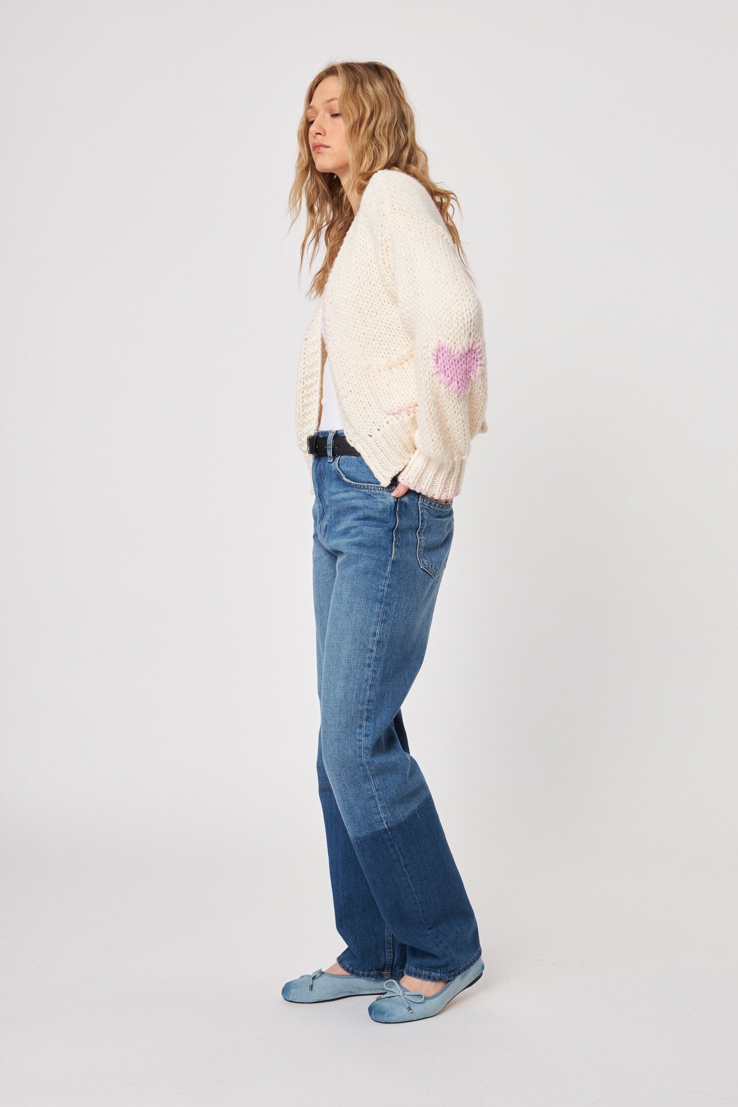 The Kendrick Cardigan is a long sleeve knitted cardigan with two front pocket. It features a stitched hart on the front right pockets and the left forearm.
