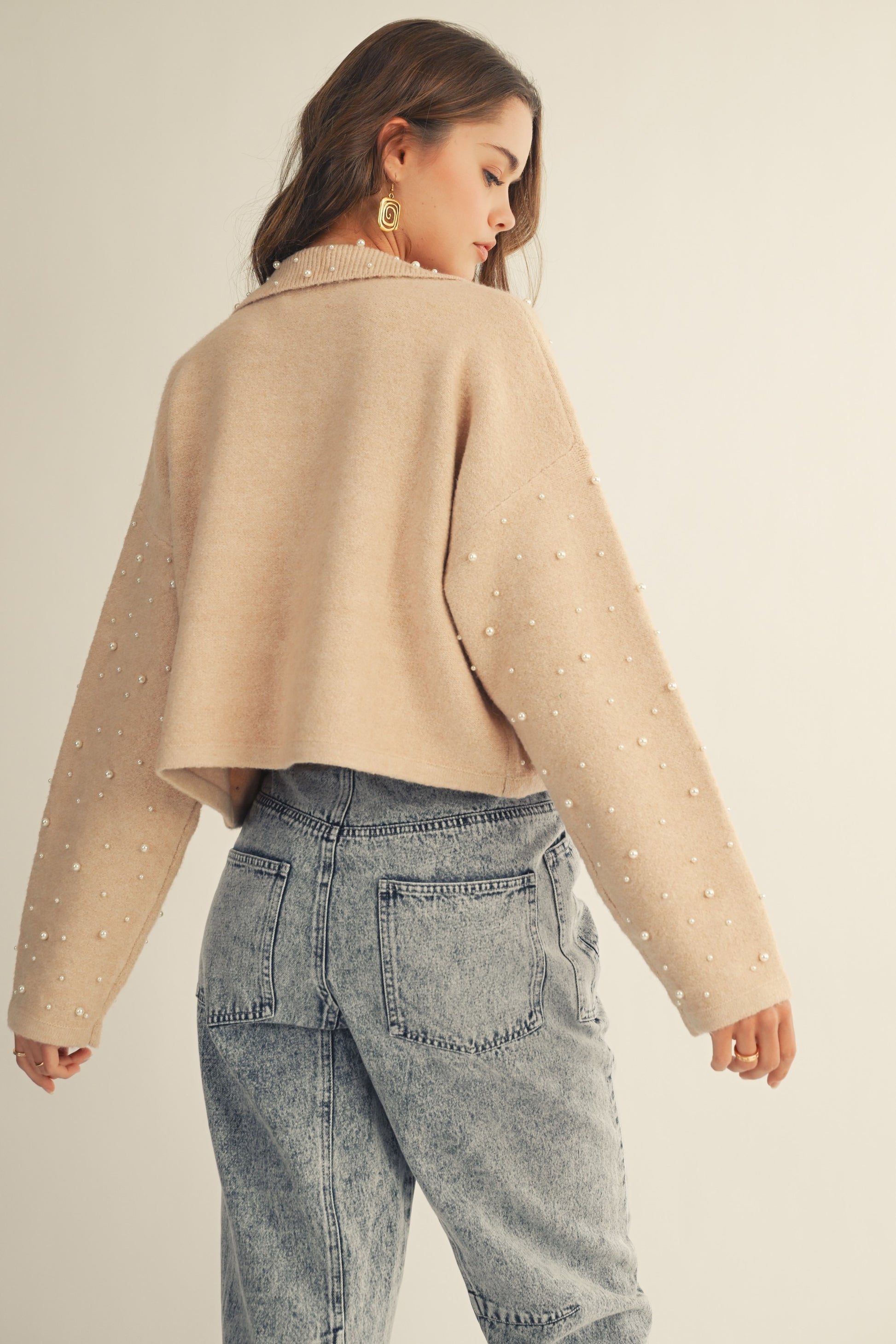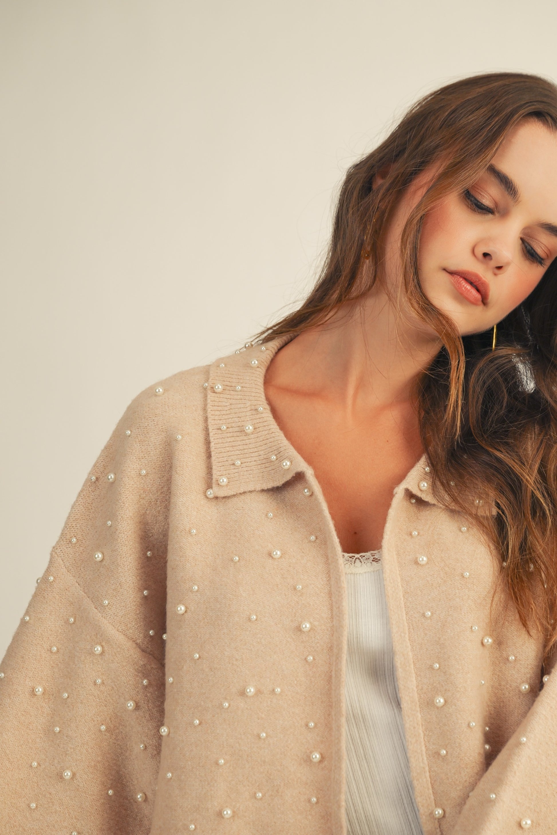 The Max Pearl Cardigan is a long sleeve open knit collared cardigan with pearls all over the front.