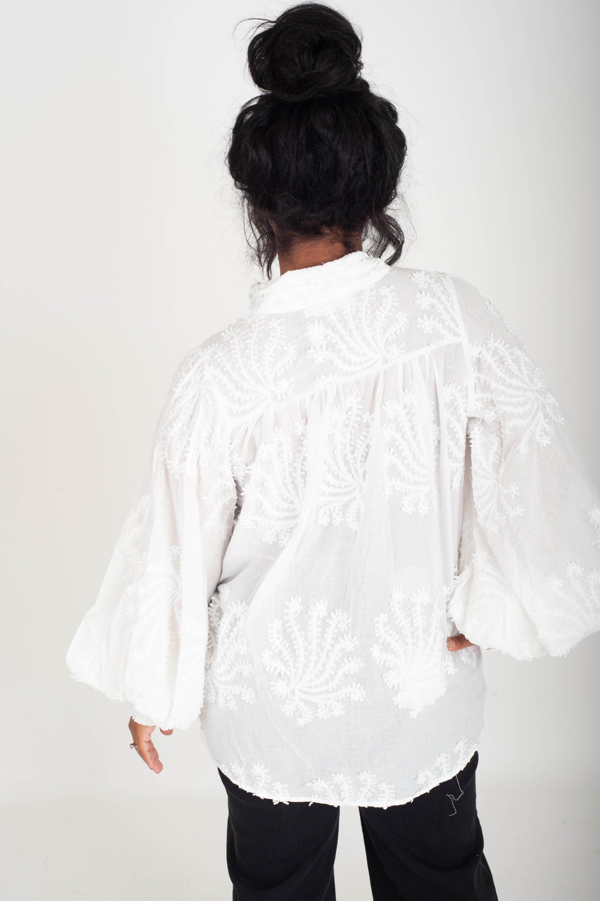 The stunning Milos Blouse is a long sleeve boxy blouse with embroidered flowers on it.
