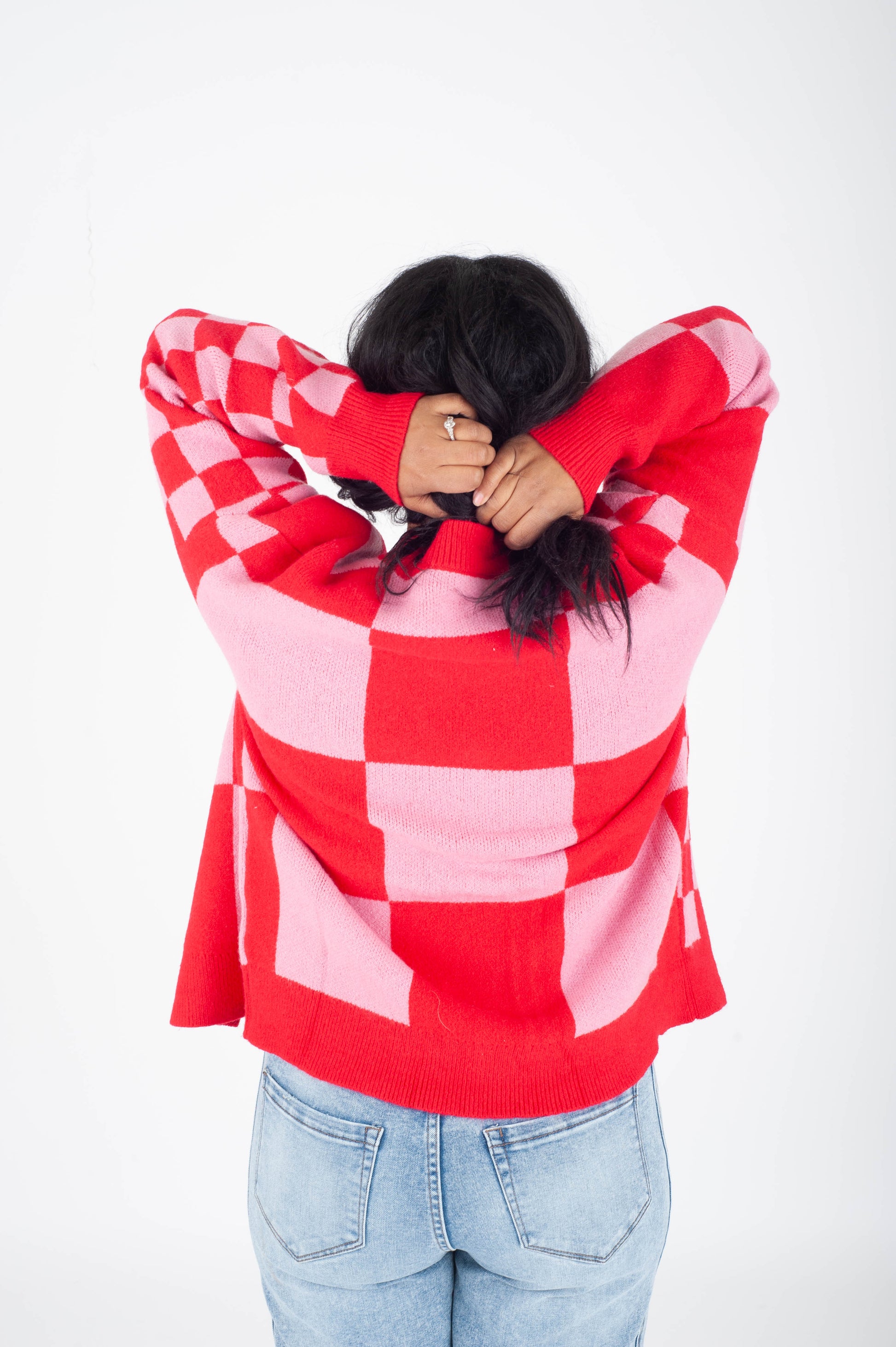 The Minnie Cardigan is a long sleeve button up cardigan that features varying size checkered prints throughout. It has a v-neckline, a drop shoulder and cuffed wrists.