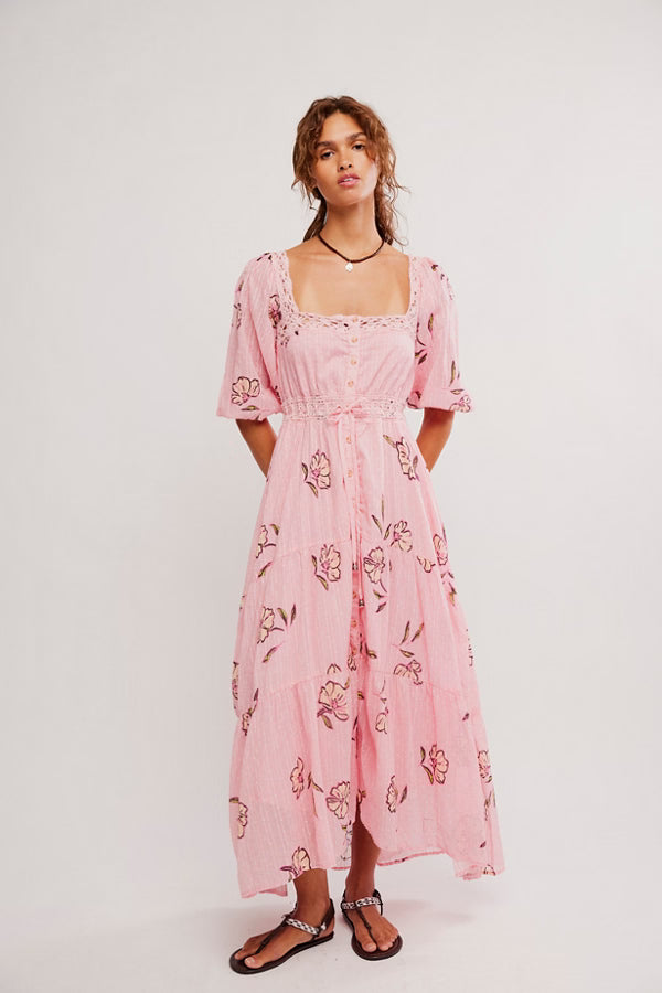 It doesn’t get sweeter than this stunning maxi dress, featured in a cascading cotton fabrication with lace detailing and a button-front closure for endless styling options.