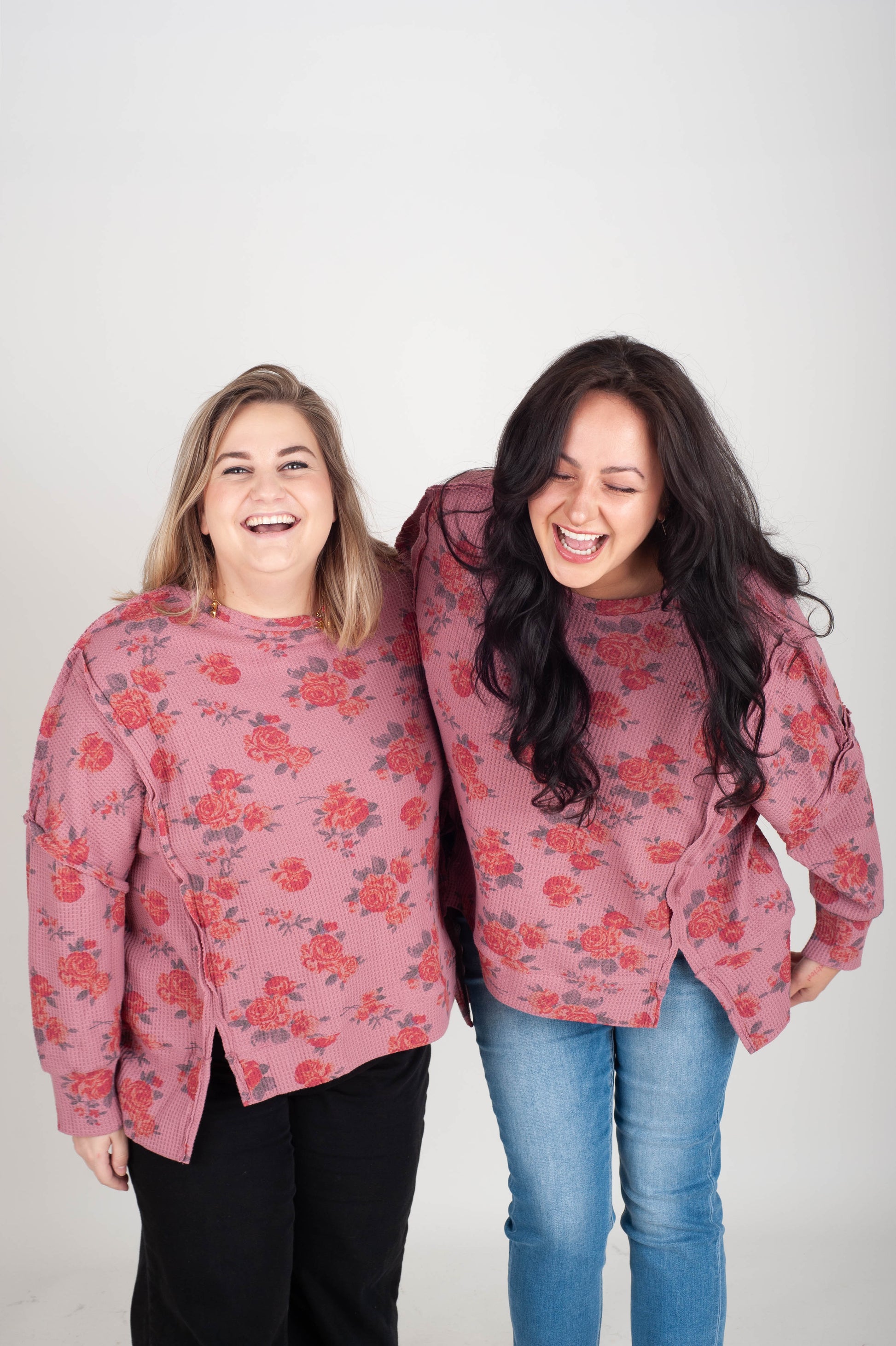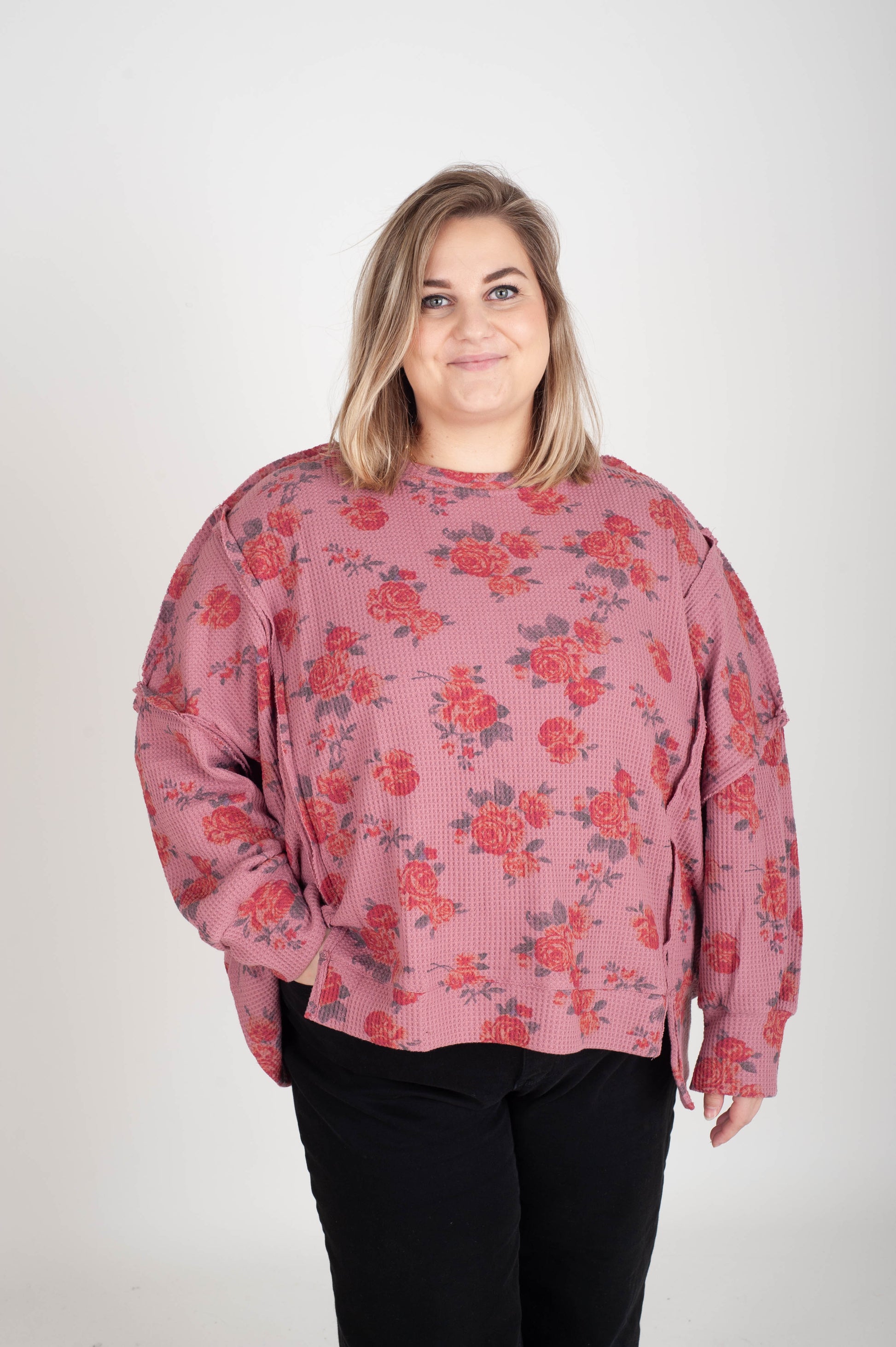 The Phoebe Thermal is a long sleeve boxy thermal top that features a round neckline, a drop shoulder, two side slits and a high low hem.