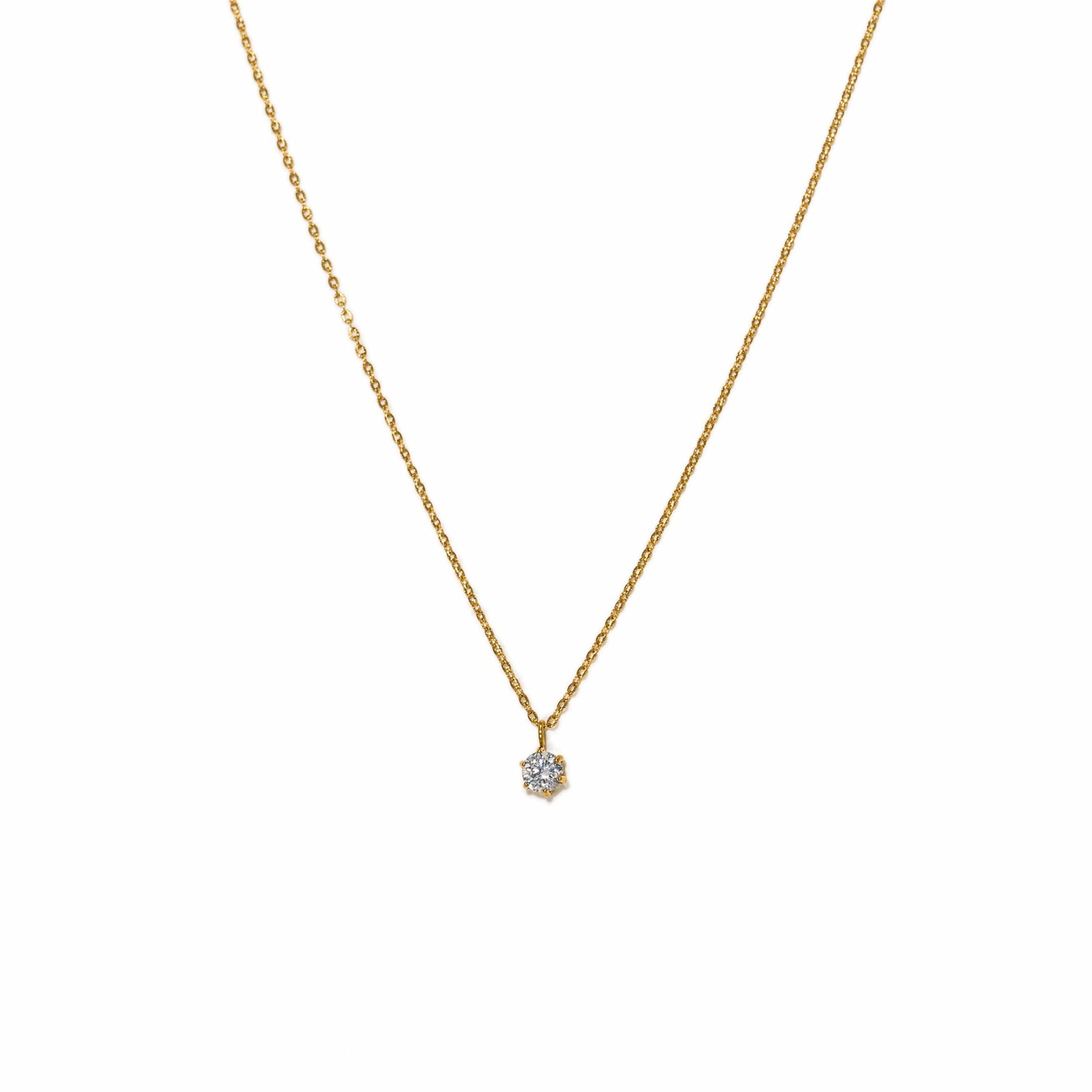The Sol Necklace features a 16" + 2" Extender, 5mm Cubic Zirconia Pendant creystal and is fabricated from 18K Gold PVD and stainless Steel.