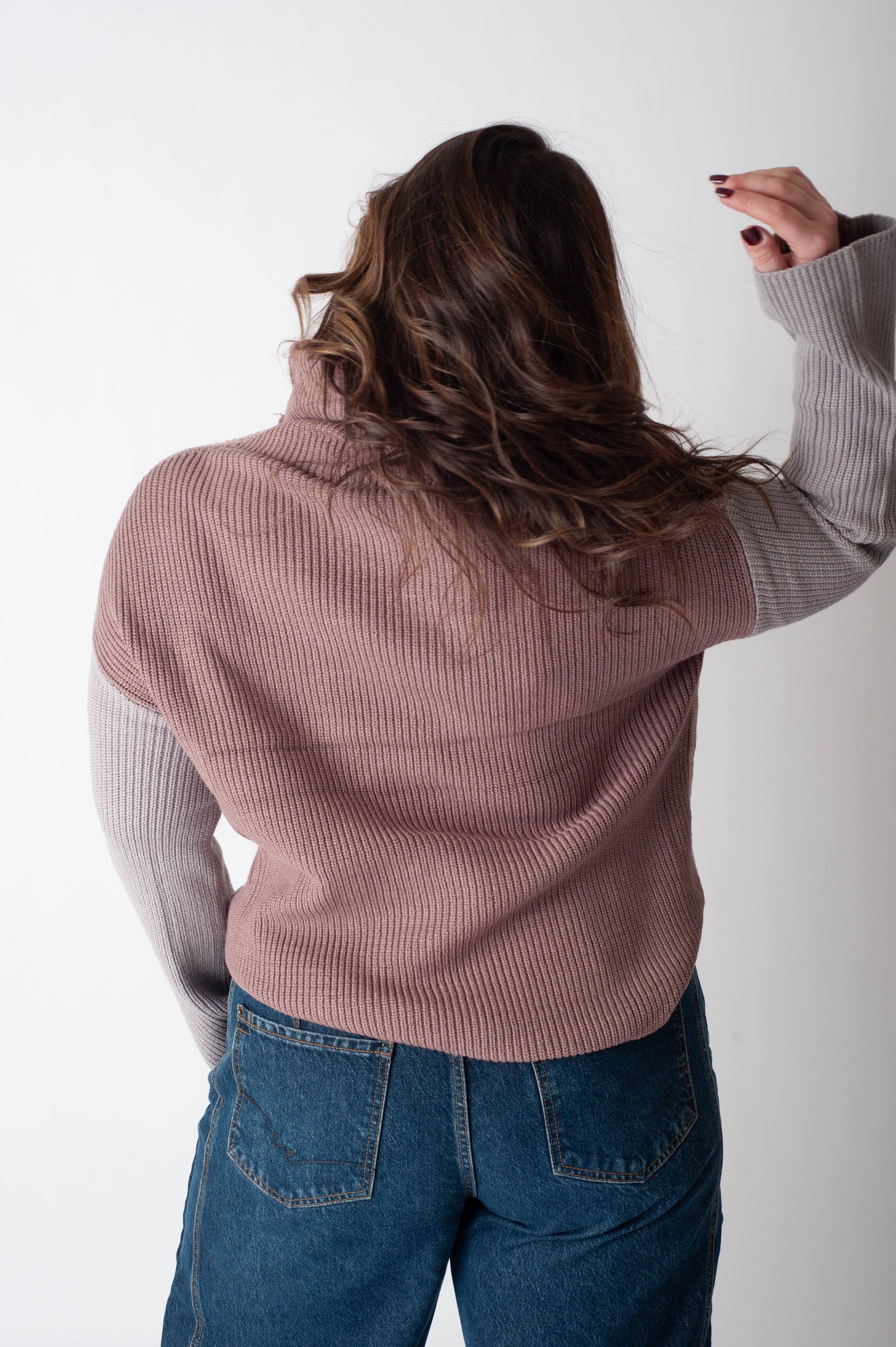 The Vera Sweater is a long wide sleeve turtleneck sweater with three gorgeous colour blocks throughout. It features a drop shoulder, a cozy ribbed fabrication and a cuffed wrist.