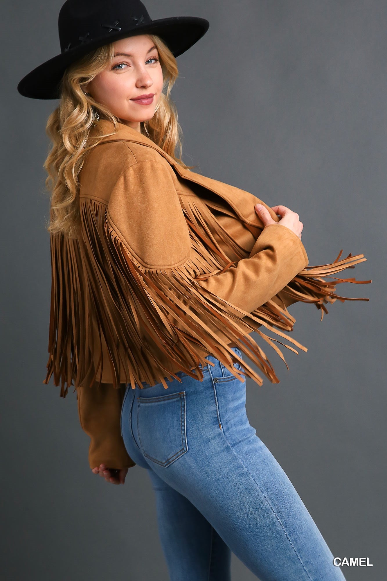 The Winona Jacket is a faux suede open front jacket with fringe details.