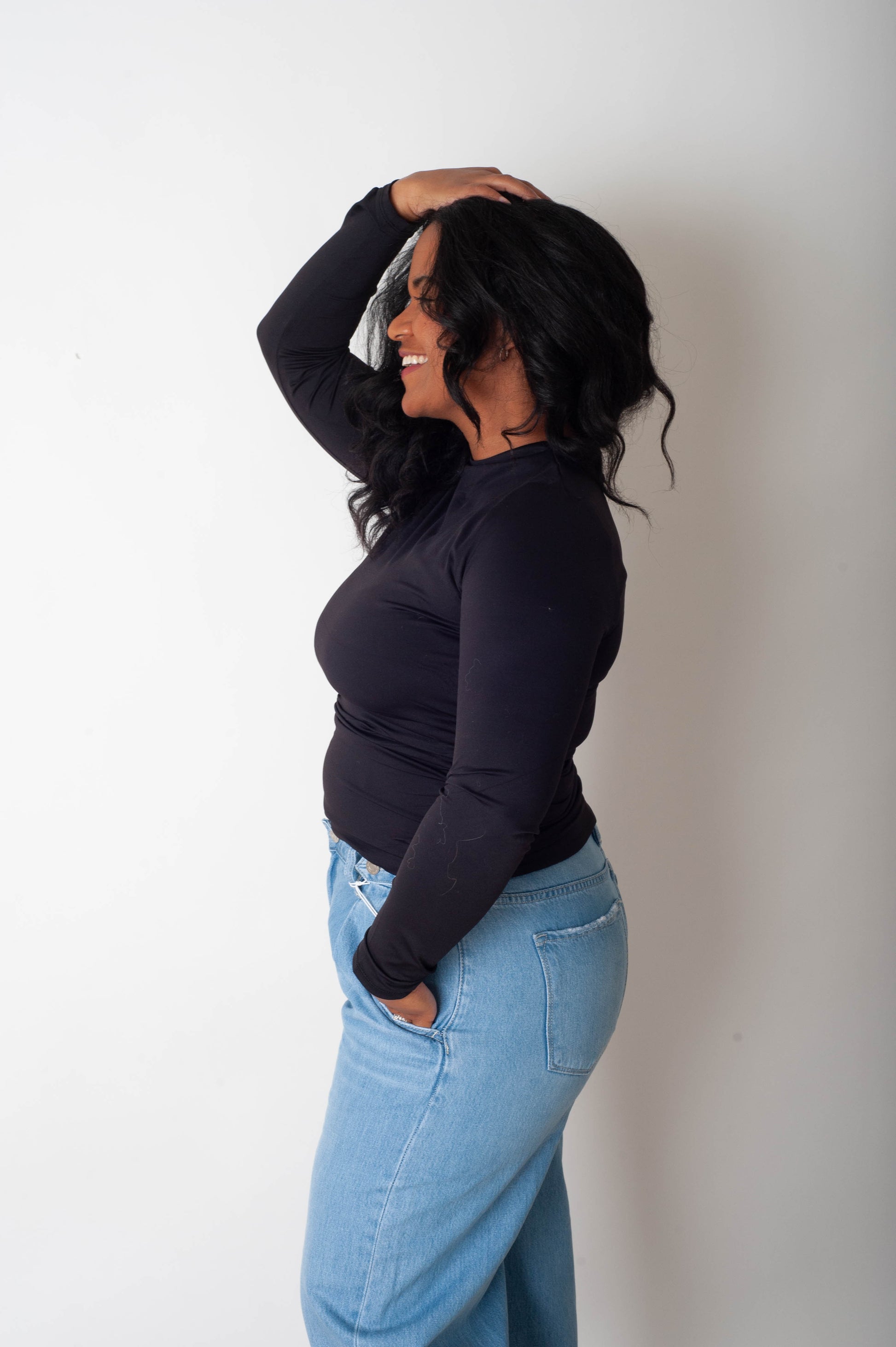 A longsleeve basic with ruched sides and a faux funnel neckline. In our second skin fabric.